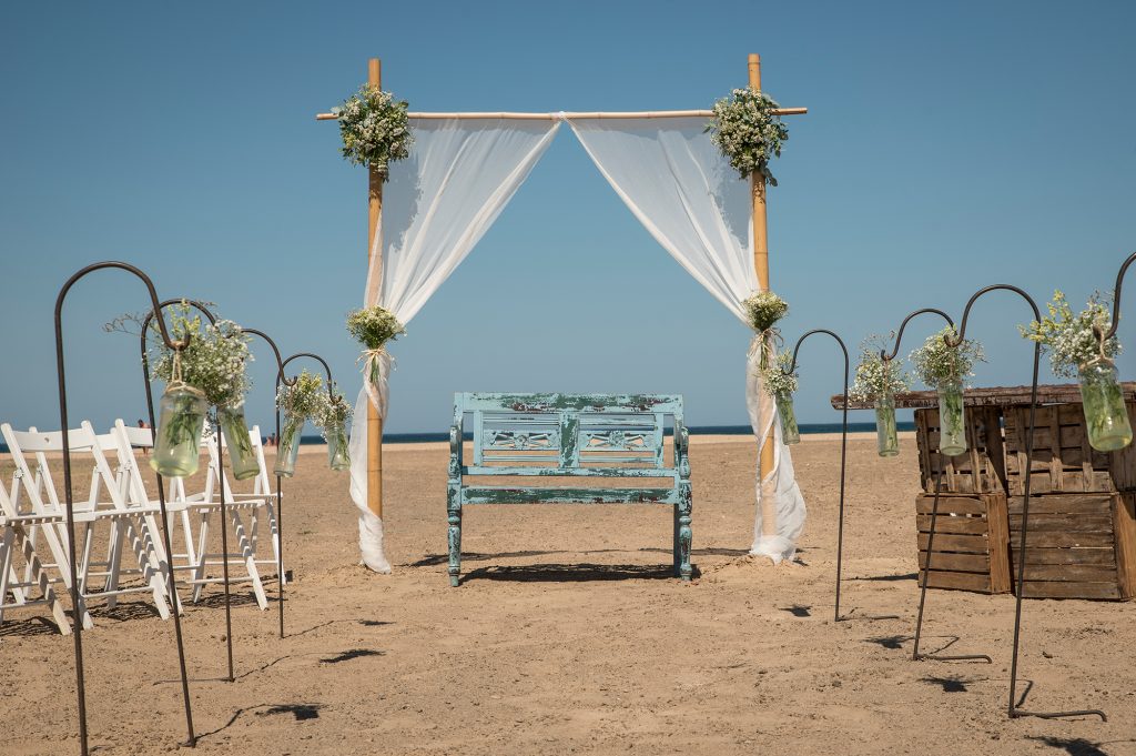 No todas las playas permiten bodas, así que lo primero es informarte de los permisos municipales. Las horas ideales suelen ser al atardecer: la luz es más suave, las fotos salen espectaculares y la temperatura es más agradable para todos, aunque si te gustan las bodas de día ve a por ello. Las bodas de día son muy disfrutonas, el inconveniente suele ser la luz que es muy dura. Pero no eres más de cielos azules y largas horas de luz piensa en un altar compuesto por gasas blancas, crean un espacio de luz suave precioso para las fotos.